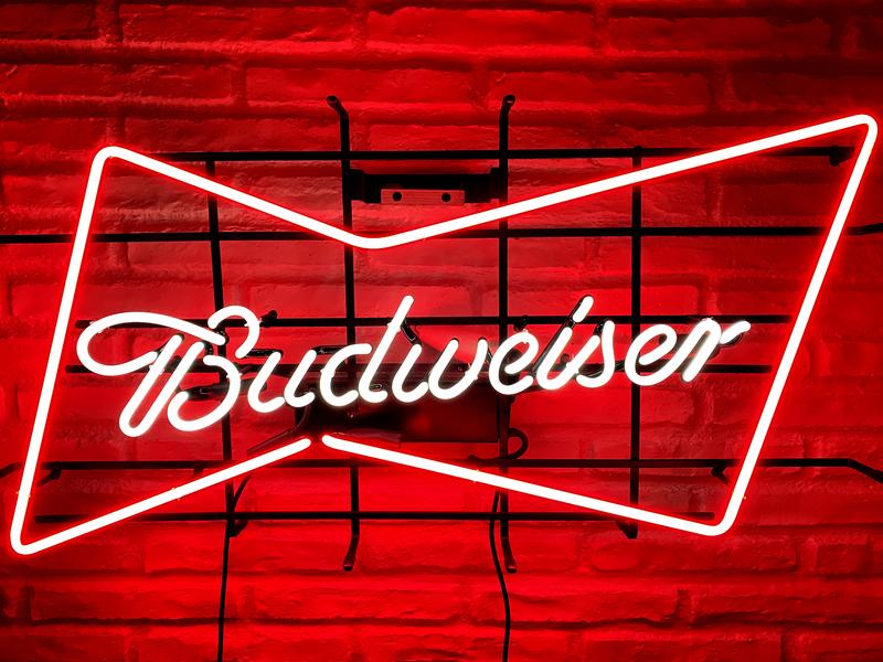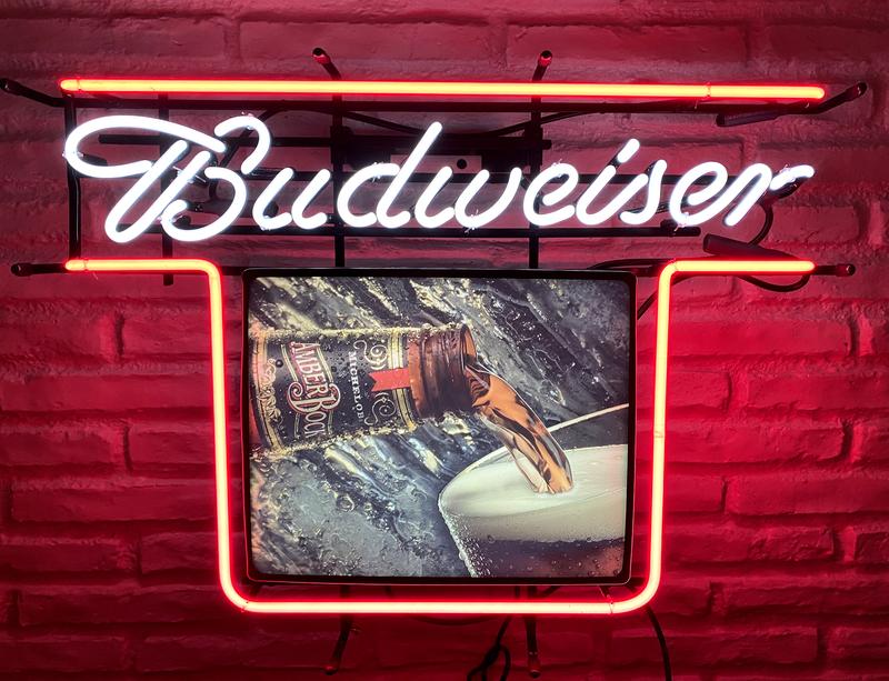 Die Neon-Leuchtreklame ist aus Neon-Leuchtstoffröhren die mit Argon, Krypton, Xenon oder anderen Edelgasen gefüllt. Die Leuchtgase bringen den Schriftzug farblich zum leuchten und geben der Vintage Neon-Anlage den typischen Neonschein. Das Budweiser Logo strahlt in rot die hintere Wand an.